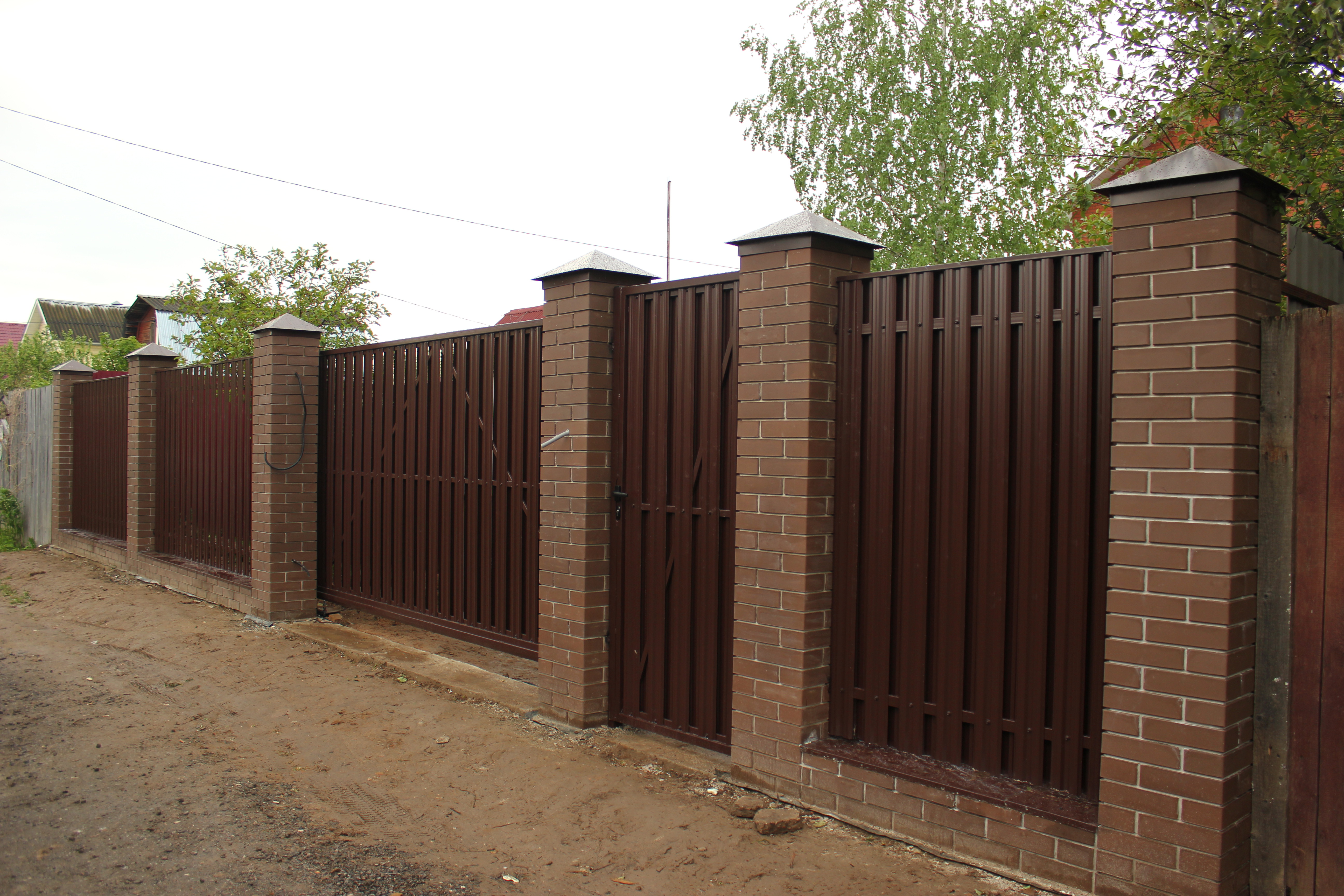 Выбрав кирпич можно создать разнообразные комбинации с другими материалами (профнастилом, кованым железом, поликарбонатом и т.д.), что позволит создать особенный и солидный вид. Данный материал очень надежен и не нуждается в уходе, а его срок службы более 50 лет.